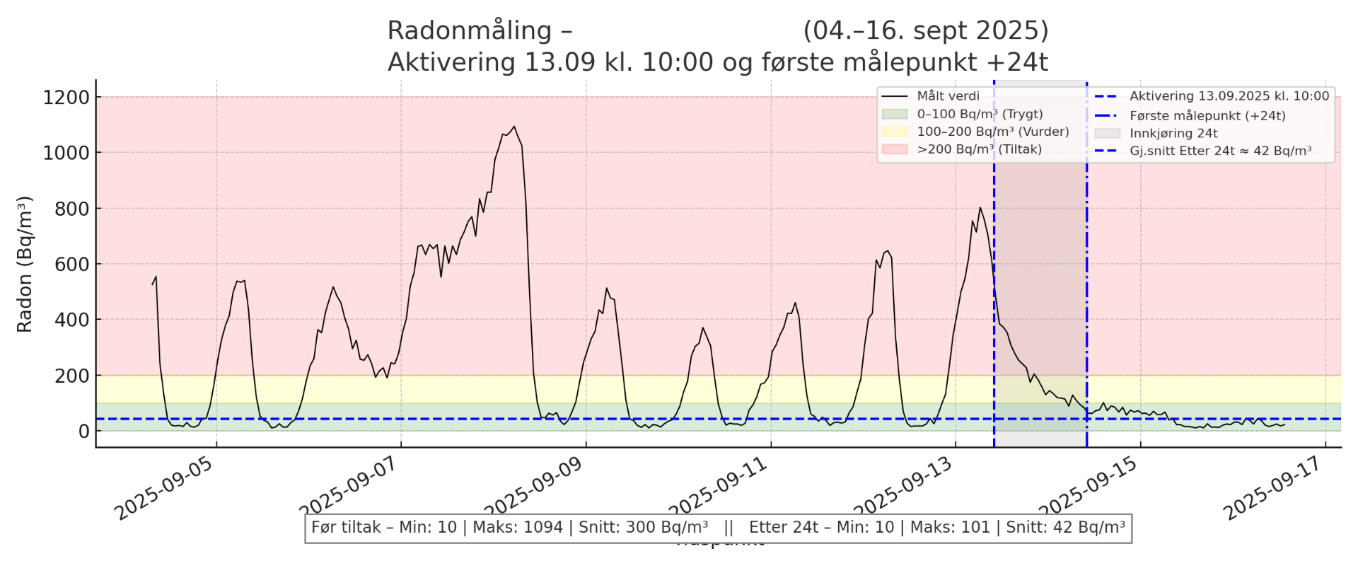 Videre mÄlinger dokumenterer at nivÄet stabiliserte seg godt under 100 Bq/m³. Dette bekrefter at installasjonen gir en trygg, effektiv og varig reduksjon av radon.